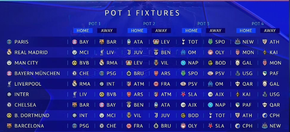 巴黎圣日耳曼(卫冕冠军):拜仁(主)、巴萨(客)、亚特兰大(主)、勒沃库森(客)、热刺(主)、葡体(客)、纽卡(主)、毕巴(客)