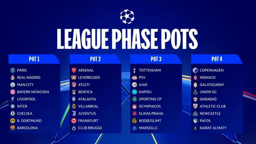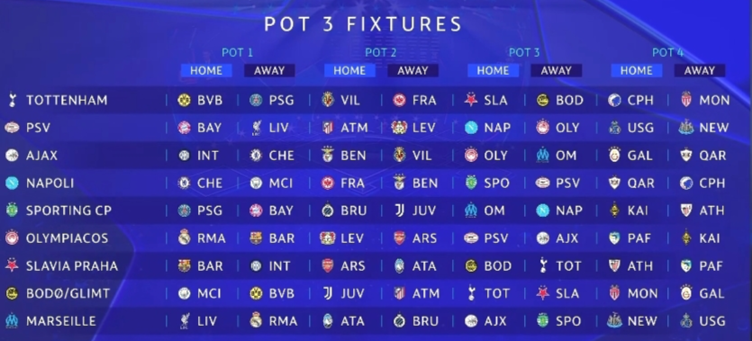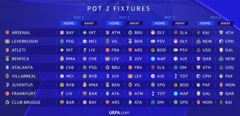 这是欧冠赛制改革后的第2个赛季,在全新的联赛阶段中,每支球队都将根据抽签从4个档位分别选出2个共计8个不同对手,进行4主4客共计8场比赛。